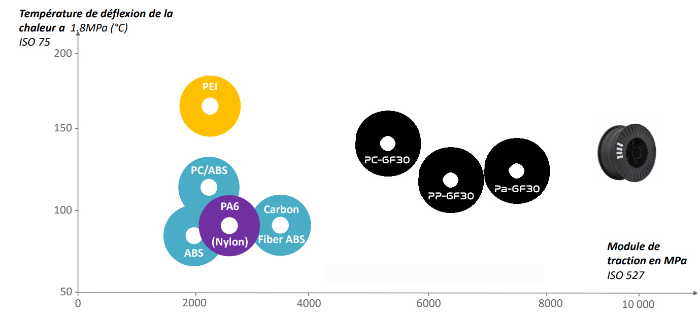 Un graphique valant mieux qu'un long discours, on s'apercoit rapidement que les filaments comme le PEEK, PEI (même chargés en carbone) ont des modules bien inférieurs aux PA, PP, PC chargés verre.